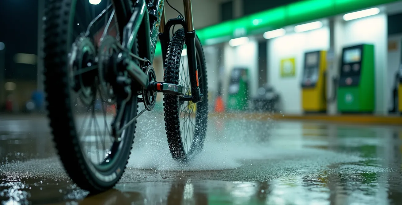 La escena es familiar para cualquier ciclista con poco tiempo: la bicicleta cubierta de barro después de una salida épica y la tentadora lanza de agua a presión de la gasolinera más cercana. Parece la solución perfecta: rápido, potente y barato. Sin embargo, esta conveniencia esconde una trampa destructiva. La mayoría de los consejos se limitan a un vago «ten cuidado», pero no explican el porqué. No se trata solo de que el agua entre donde no debe; se trata de una combinación letal de presión, temperatura y química que las bicicletas modernas, con sus tolerancias de precisión, simplemente no pueden soportar.