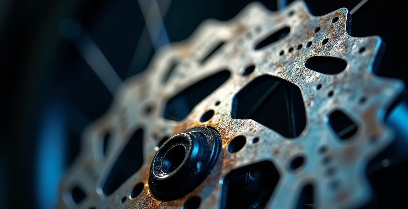 Todo ciclista conoce ese momento de pánico. Un sonido agudo, metálico y horrible que grita desde la rueda cada vez que tocas la maneta de freno. La reacción inicial suele ser ignorarlo, pensar que «será una piedrecita» o que «ya se quitará». Pero la cruda realidad es que ese sonido no es un aviso, es una sentencia. Es el lamento de tu disco de freno siendo arañado por el soporte metálico de una pastilla completamente gastada. Has cruzado una línea invisible, y el coste de tu mantenimiento acaba de multiplicarse.